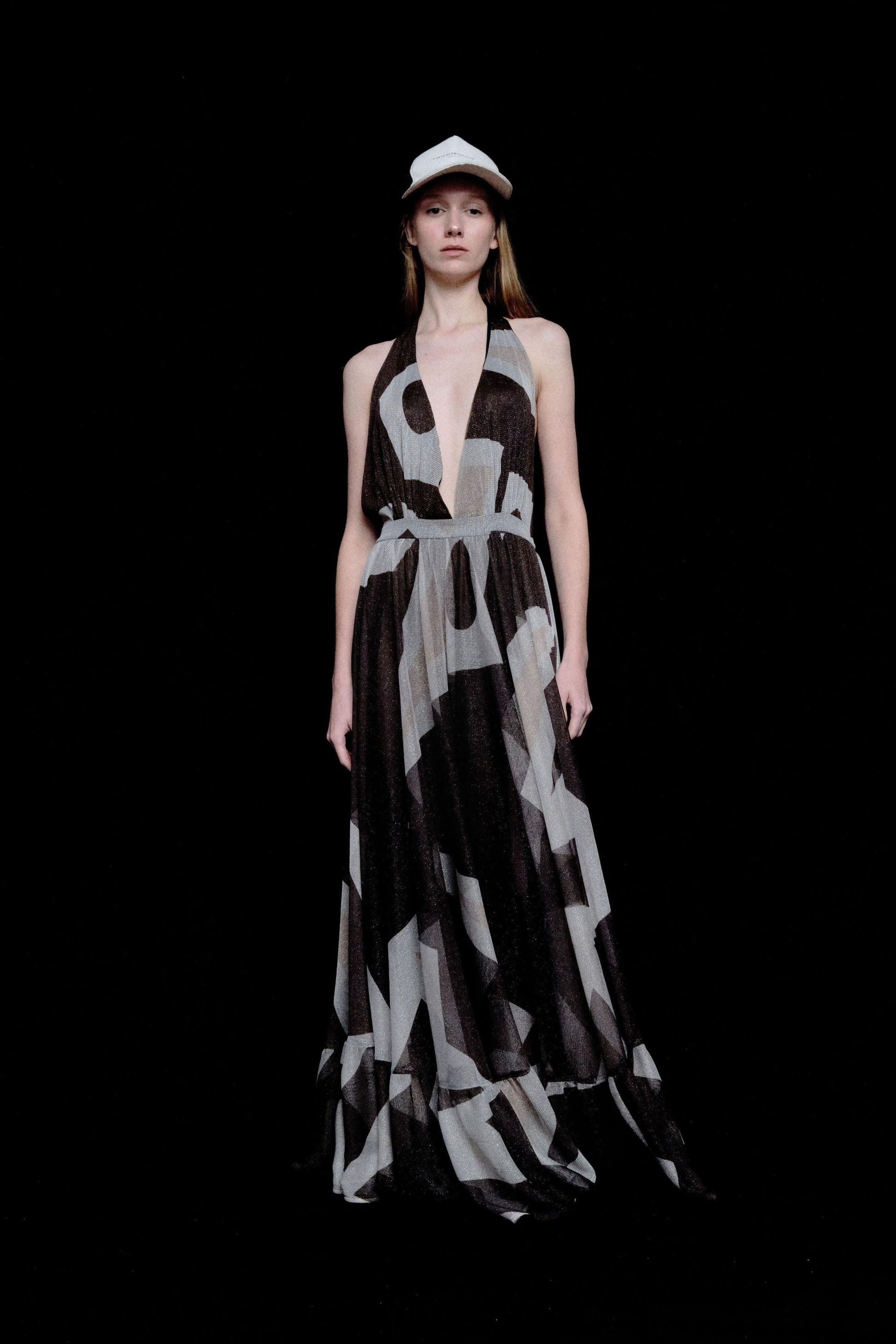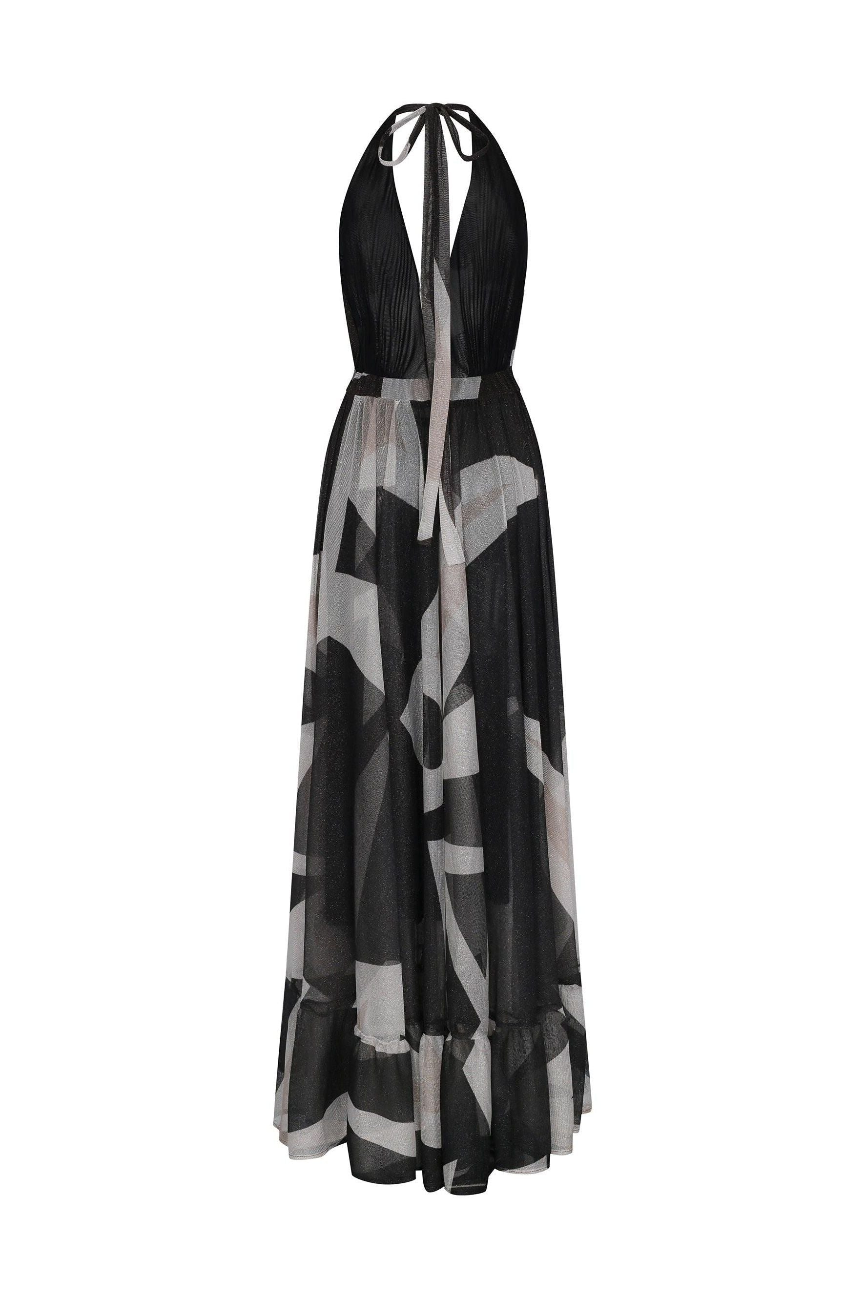 - Halter design with a deep V neckline